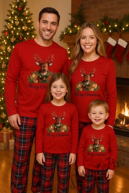 Комплектът се отличава с весел дизайн – червена горна част с коледна картинка с еленче и долнище в каре. Този дизайн ще внесе празнично настроение във всеки дом!