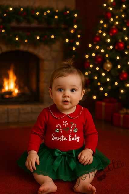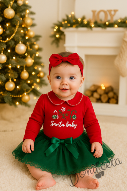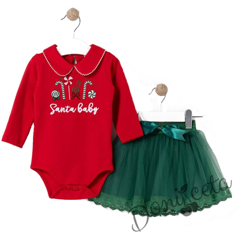 - Комплект от боди в червено с надпис "Santa baby" и коледни близалки, с пола в зелен цвят с панделка отпред.