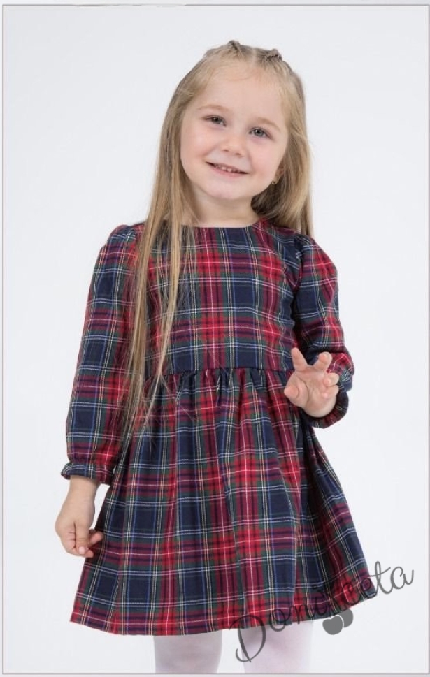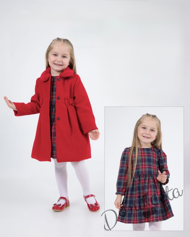 Комплект за момиче от 2 части-палто в червено и карирана рокля с дълъг ръкав
