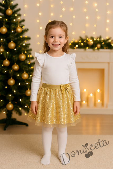 Весел комплект от пола в златисто с пайети и блузка с дълъг ръкав в бяло с кудрички на рамената.