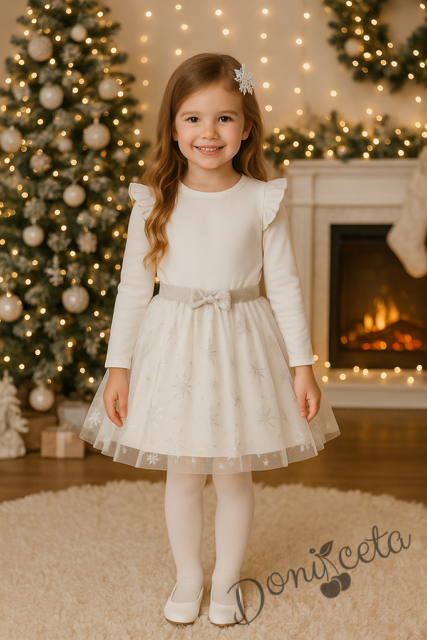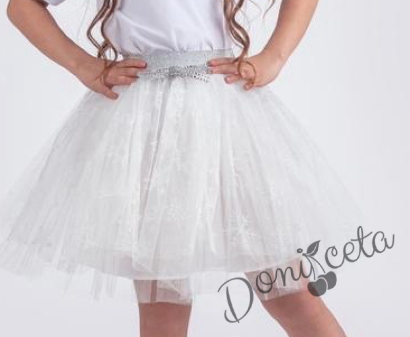 Комплект от 2 части-детска пола от тюл в бяло със снежинки и блузка с дълъг ръкав с крилца