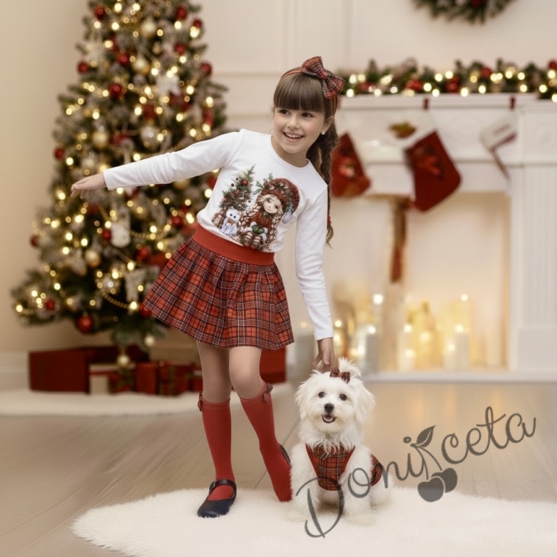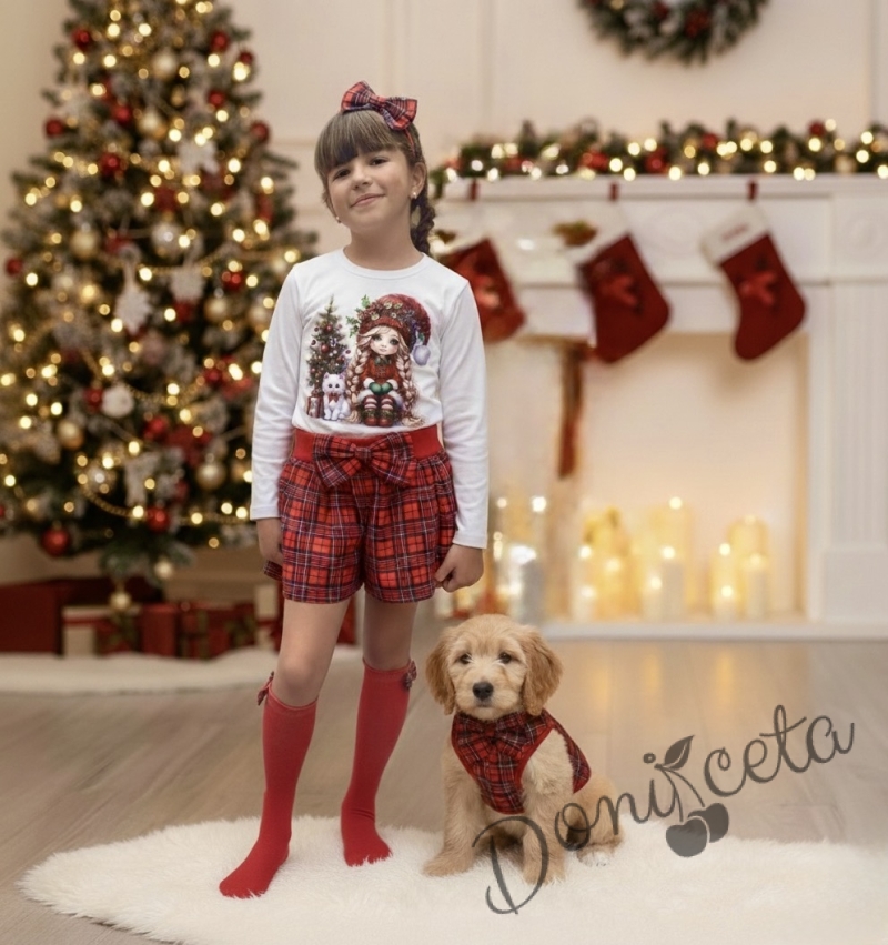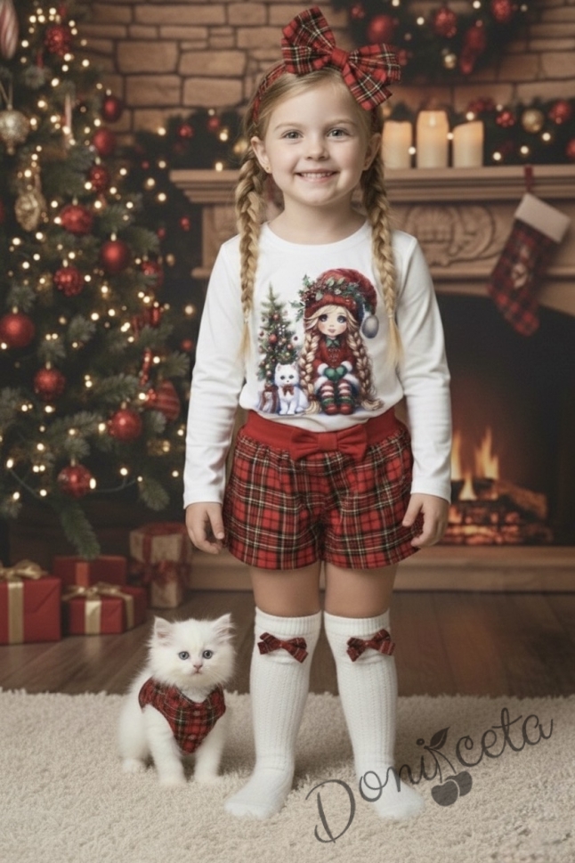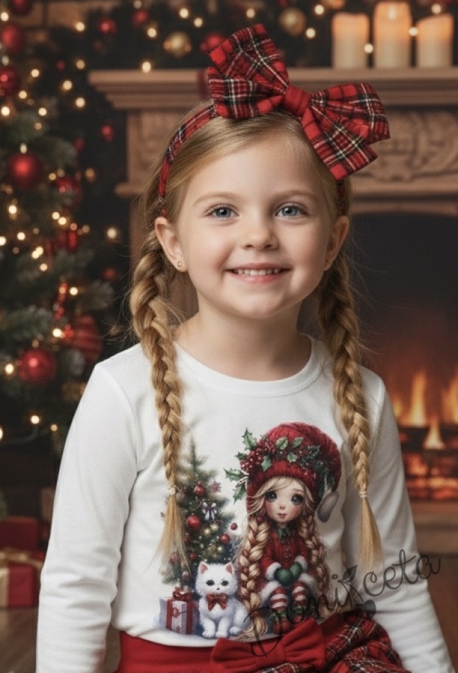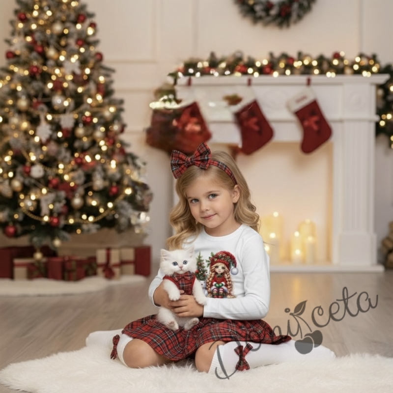 Коледна блуза в бяло с дълъг ръкав с картинка на момиче с коте и елха