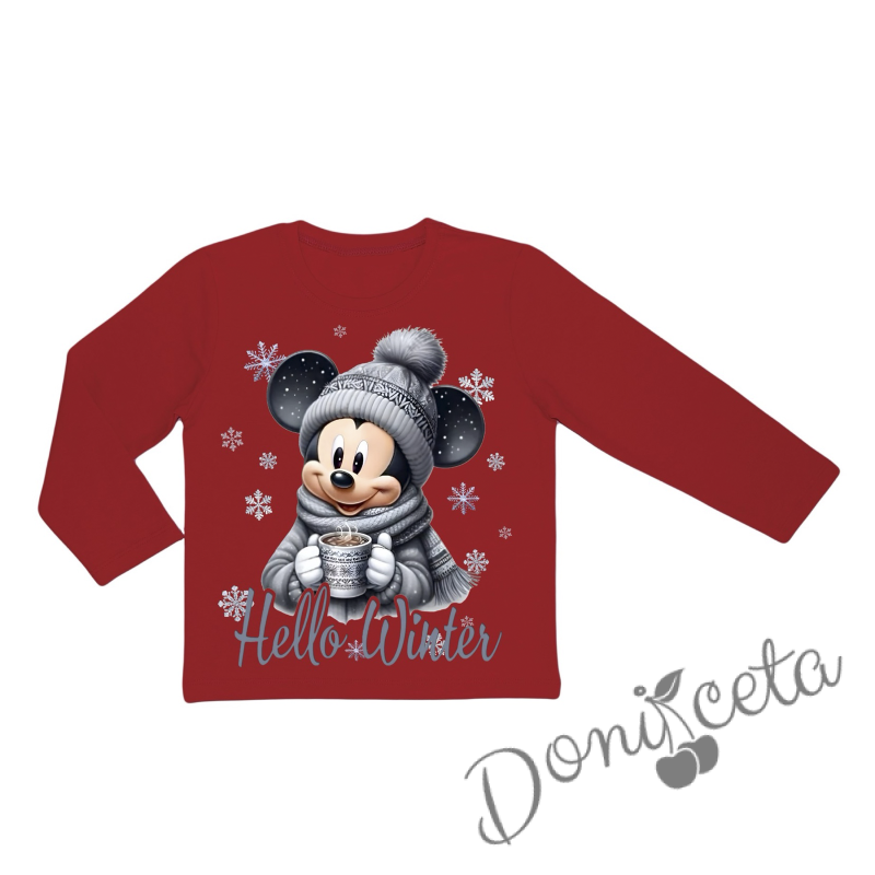 Коледна блуза в червено с дълъг ръкав и картинка на Мики Маус