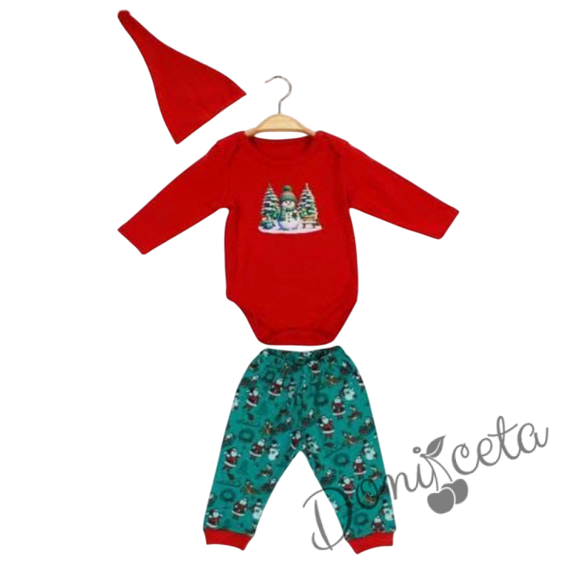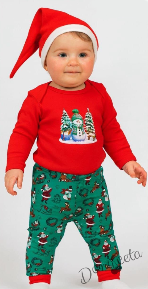 Бебешки коледен комплект от 3 части-боди с картинка на снежен човек, панталонки и коледна шапка