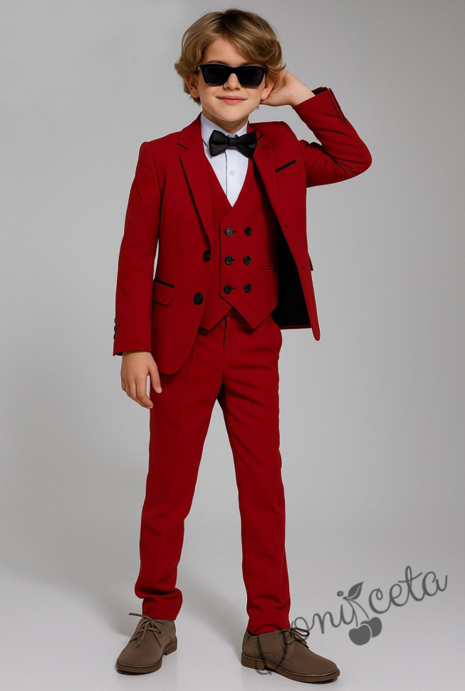 Официален комплект за момче от 5 части-сако в червено, елек, панталон, риза и папийонка