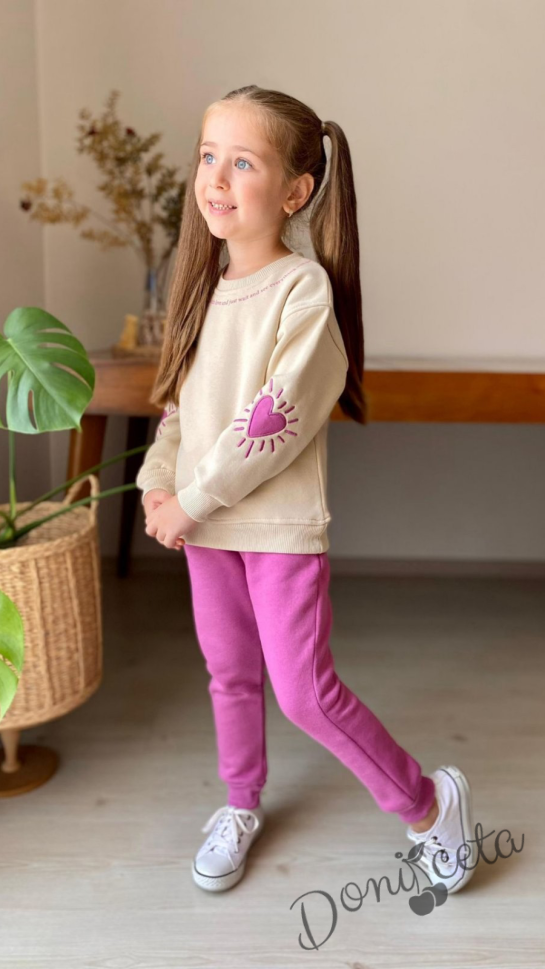 - Детски комплект за момиче от 2 части - ватирана блуза в бежово с надпис и сърце и долнище в розово.