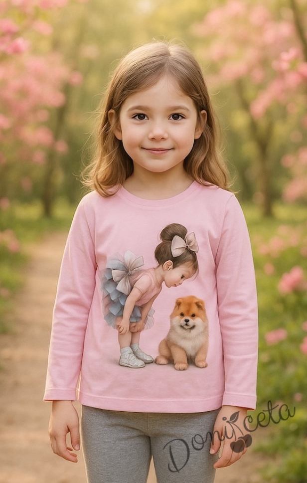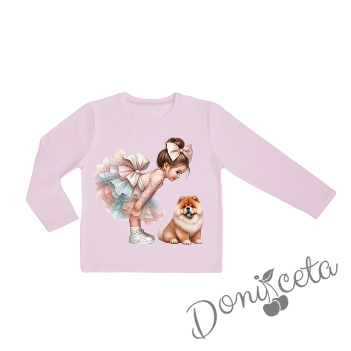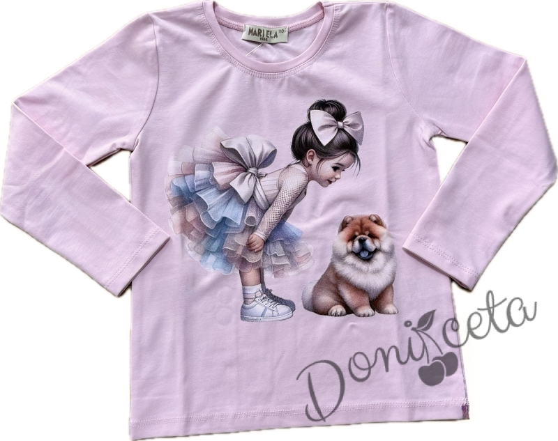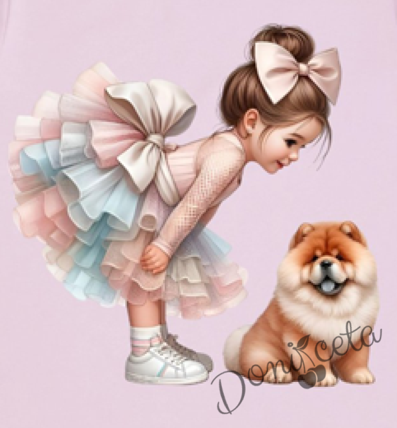 Детска блуза в светлолилаво с дълъг ръкав за момиче с картинка на момиченце и куче