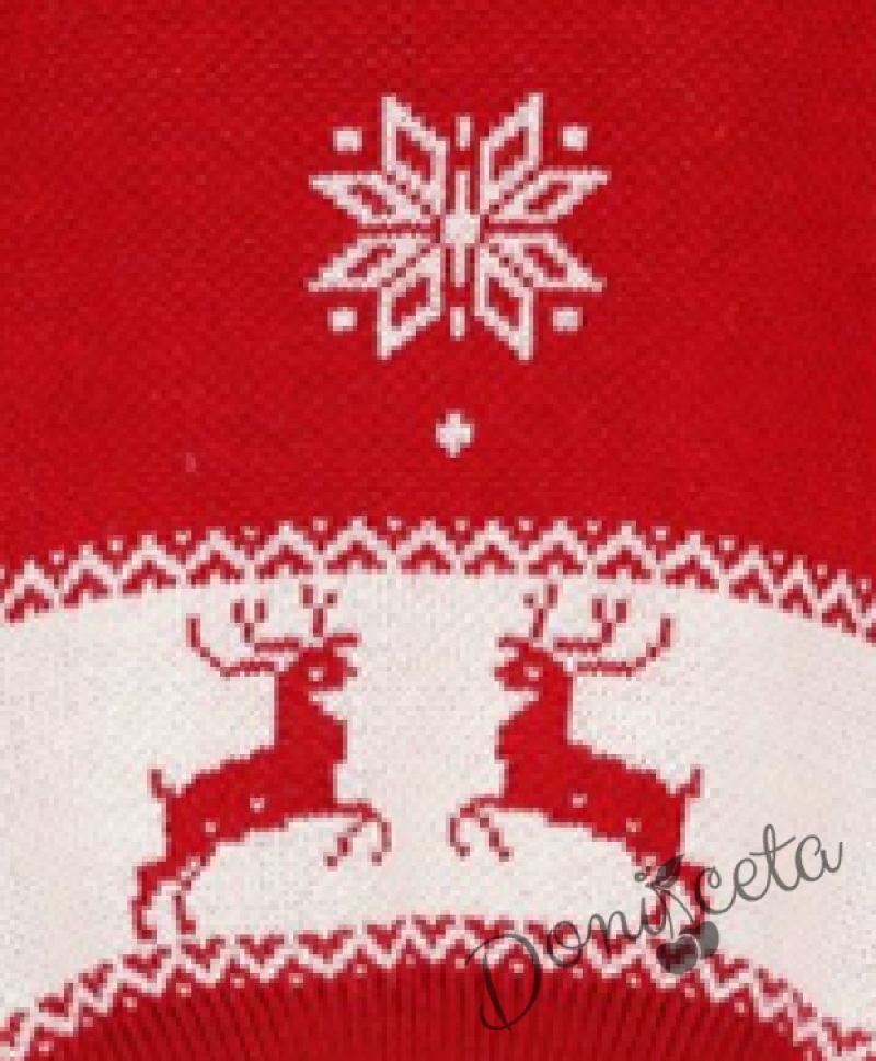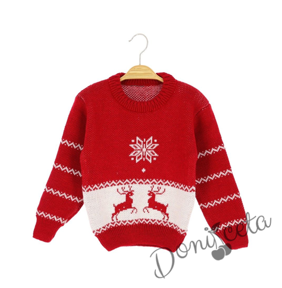 - Детски коледен пуловер в червено с коледни мотиви със снежинки и еленчета.
