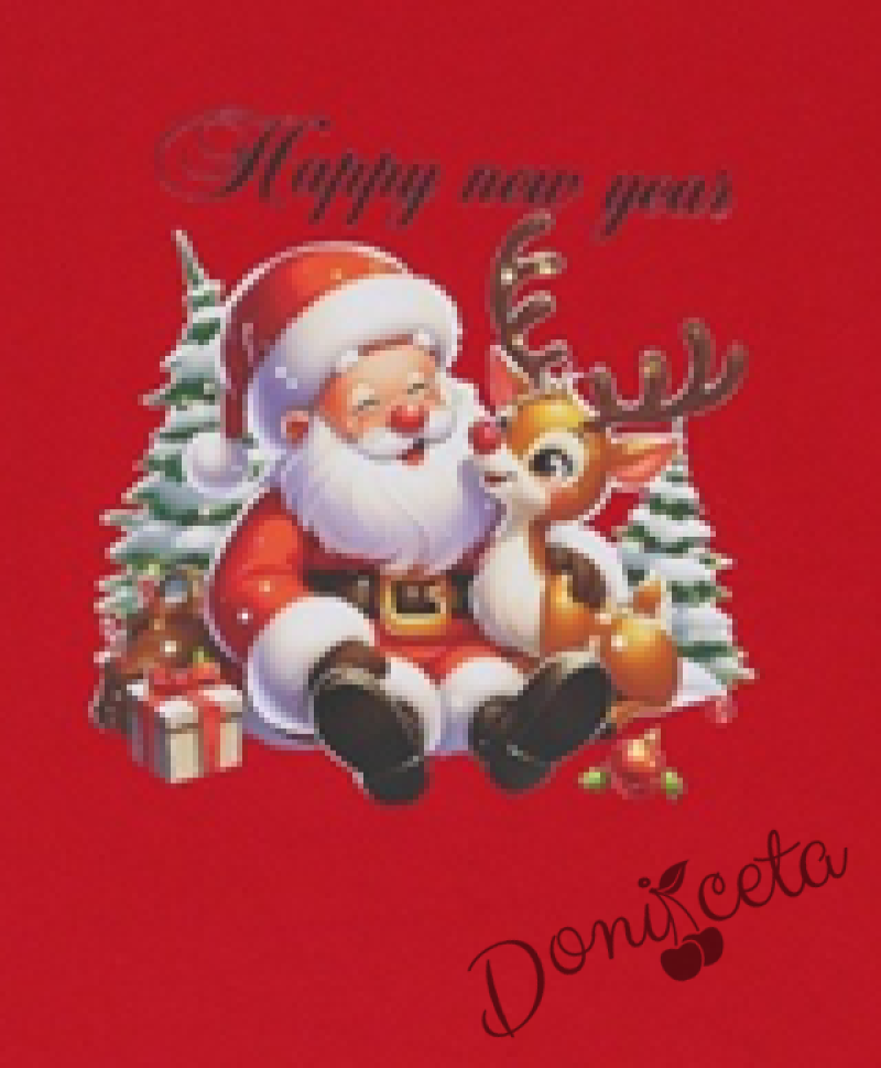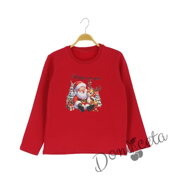 Детска коледна ватирана блуза в червено с Дядо Коледа и еленче