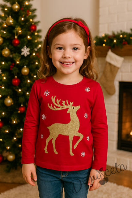 - Детска коледна ватирана блуза в червено с еленче и снежинки.