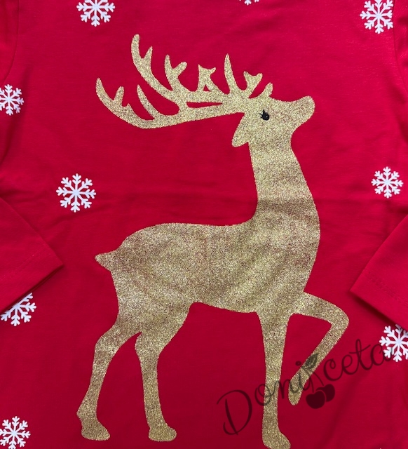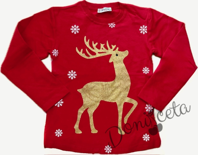 Детска коледна ватирана блуза в червено с еленче и снежинки