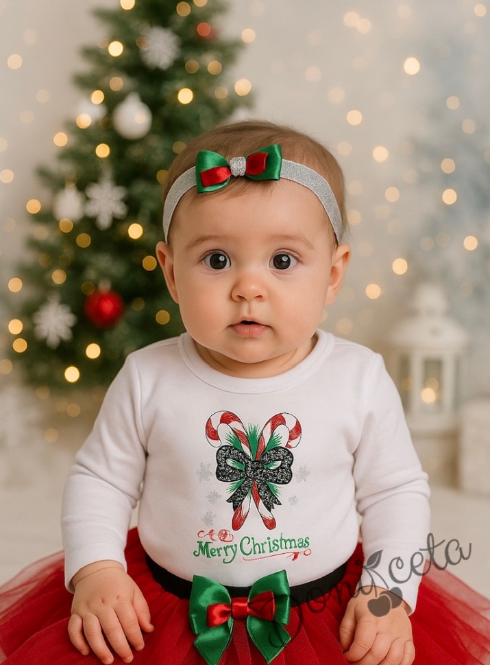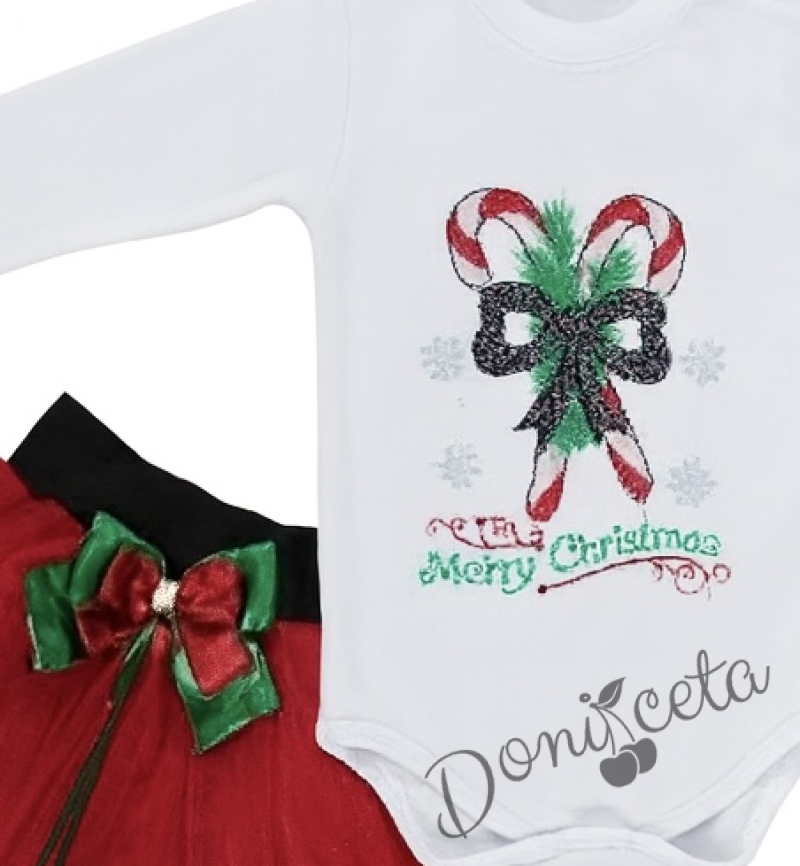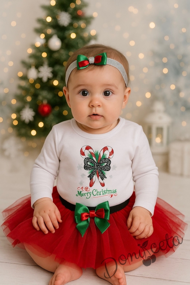 Коледен бебешки комплект от боди в бяло, пола в червено и лента за коса