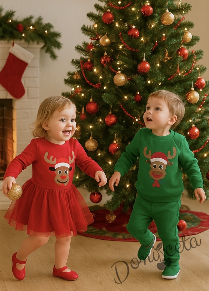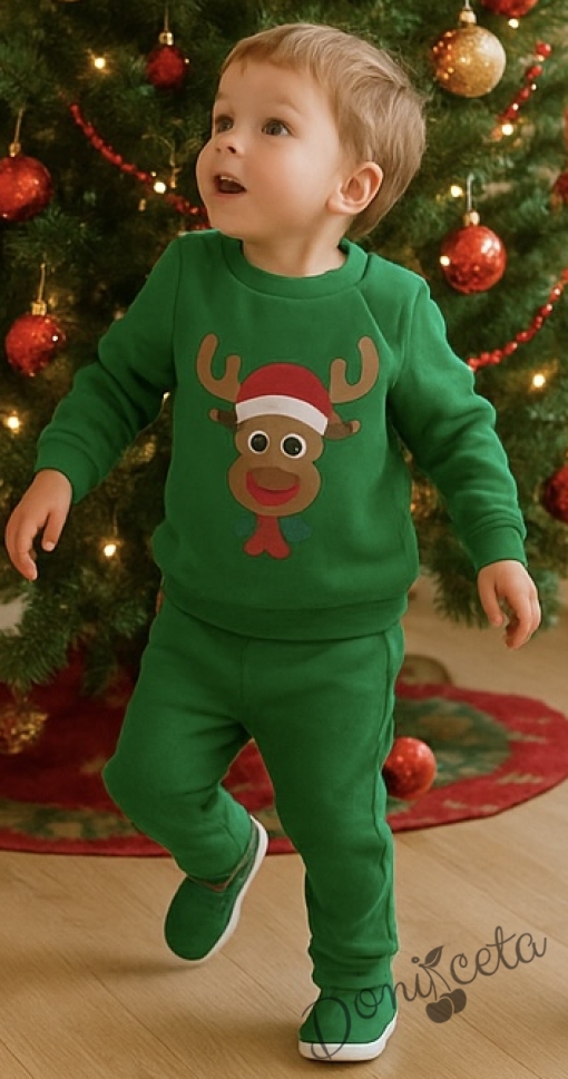 - Топъл и удобен ватиран комплект от блузка в зелено с еленче и панталонки в зелено.
