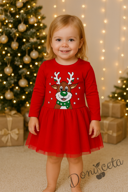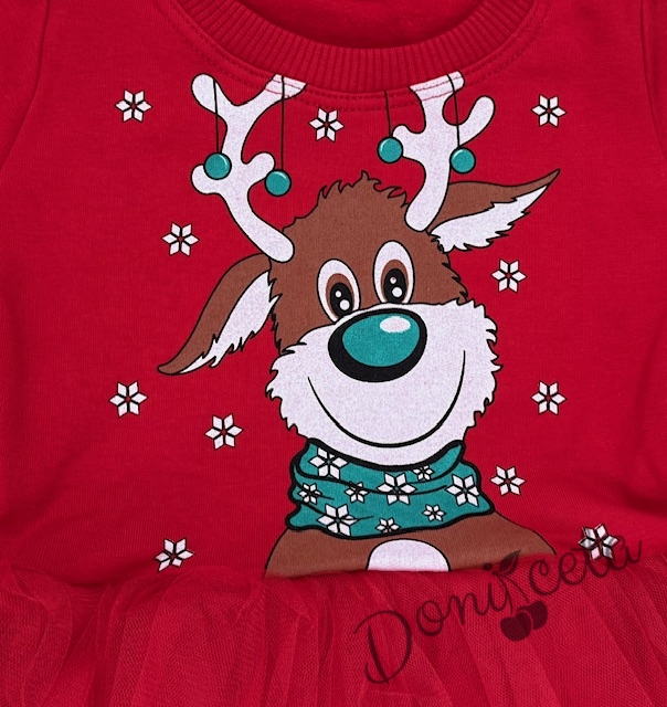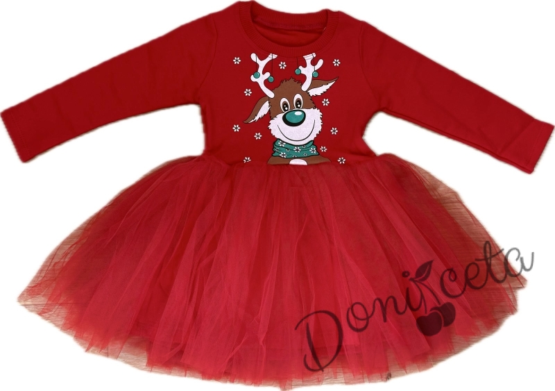 Бебешка коледна ватирана детска рокля с тюл в червено и елен