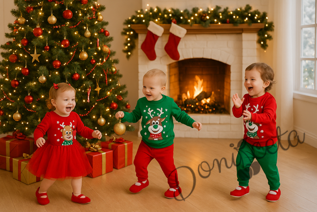 Ватирана коледна детска рокля в червено с тюл в зелено с еленче