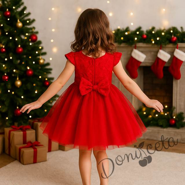 Детска рокля Крис с къс ръкав с дантела в червено и тюл от колекция Червеника