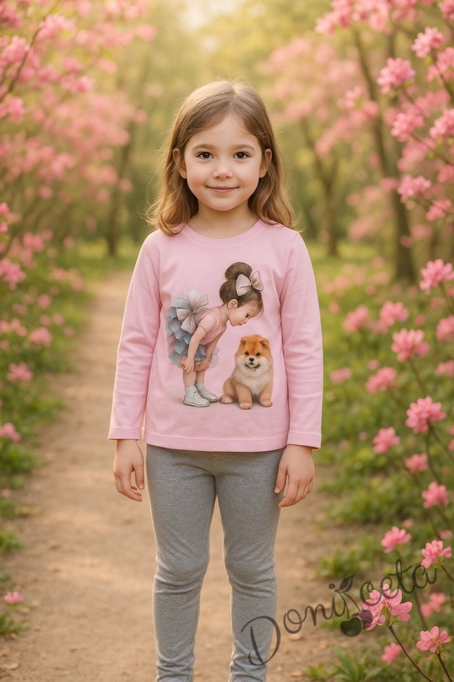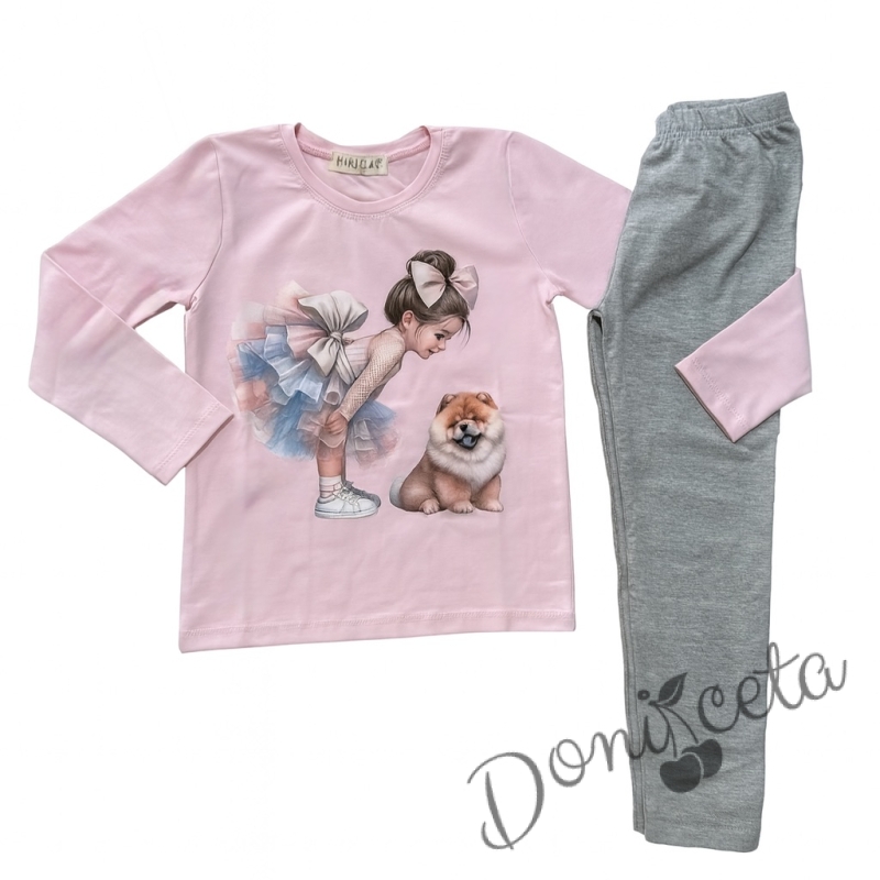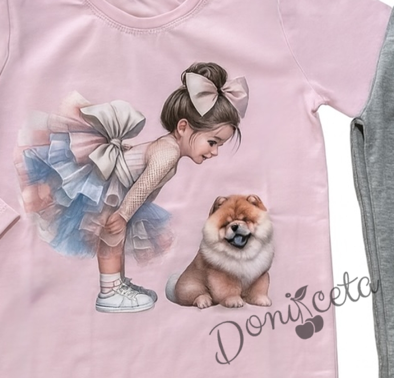 Комплект за момиче от блузка в розово с момиченце с куче и клин в сиво