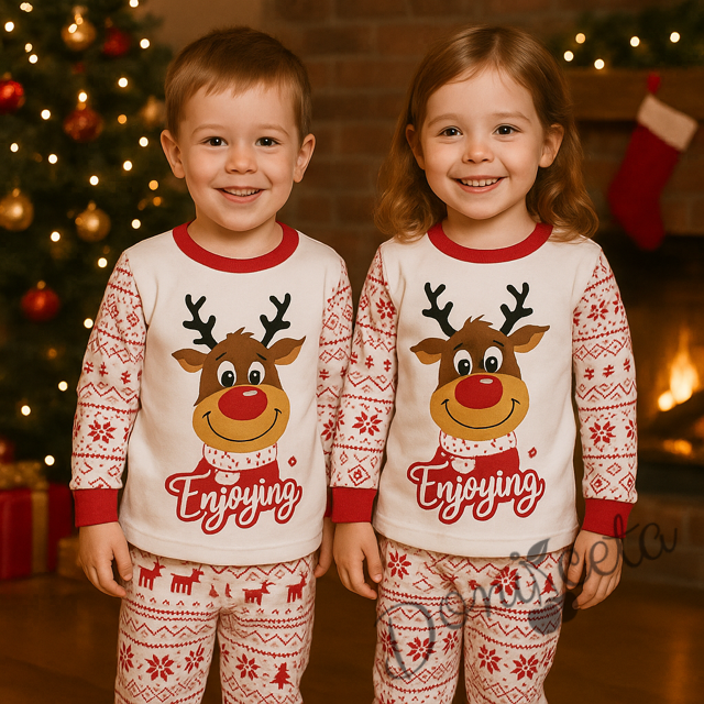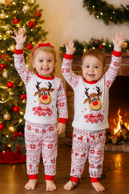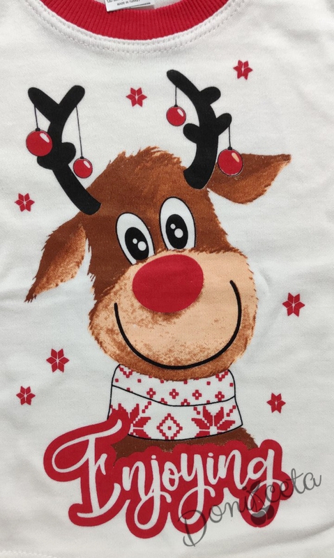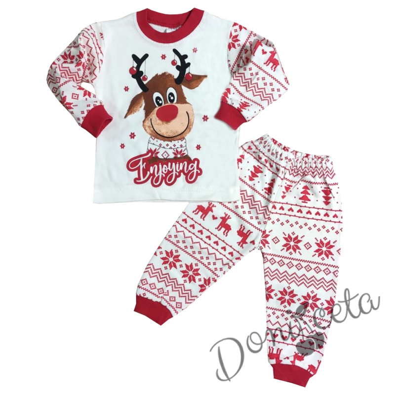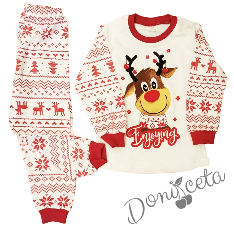 - Детска памучна коледна пижамка в бяло и червено с еленче.