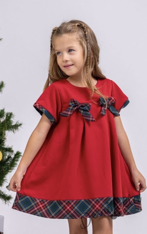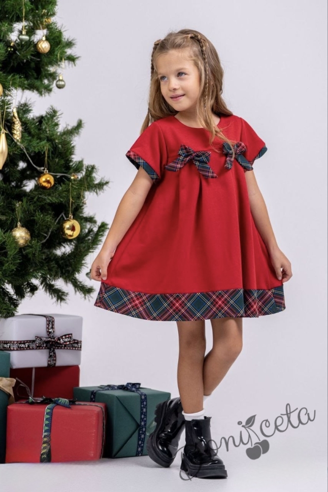 - Прекрасна памучна детска рокля в червено с панделки лента отдолу в каре.