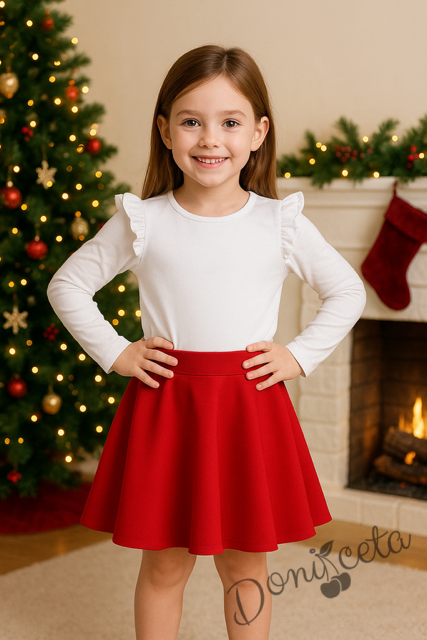 Комплект от 2 части-детска пола от неопрен клош Радост в червено и блузка с дълъг ръкав с крилца