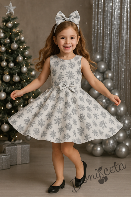 Начало МОМИЧЕТА Детска коледна рокля в бяло със снежинки в сиво