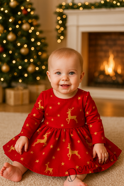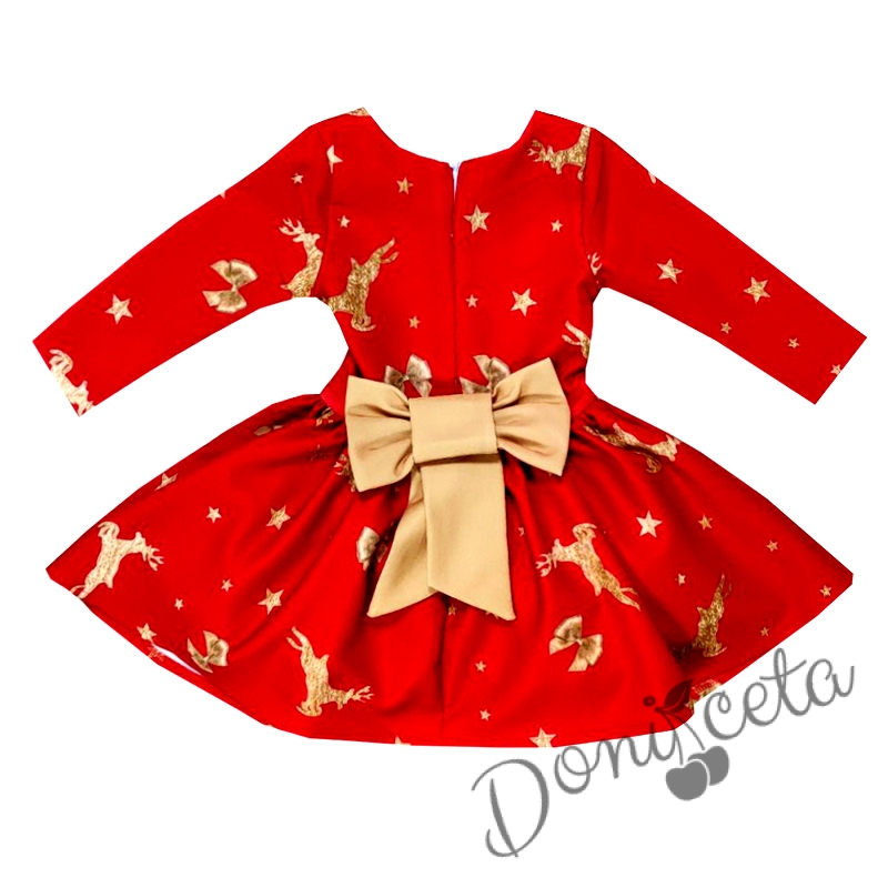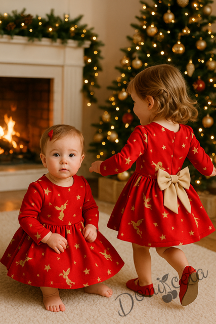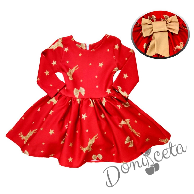 Бебешка рокля с дълъг ръкав в червено с еленчета и панделка отзад