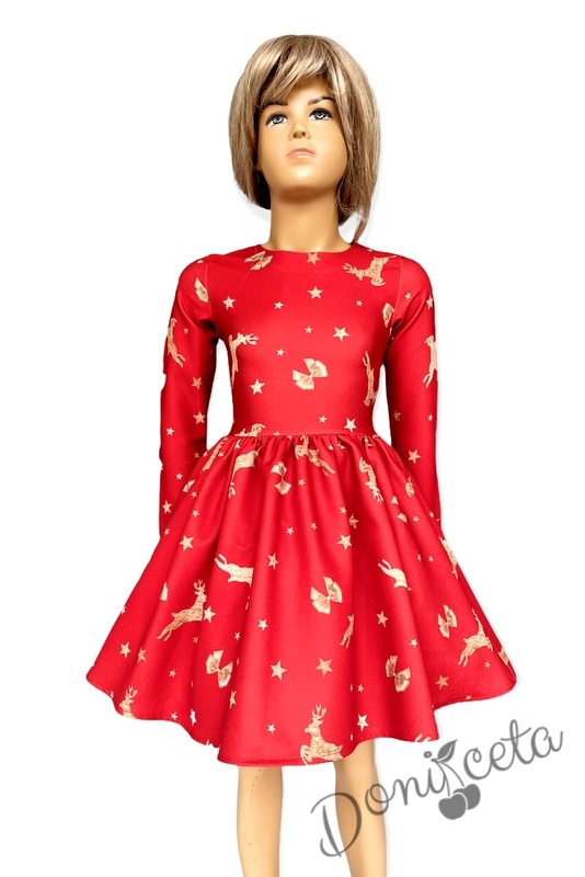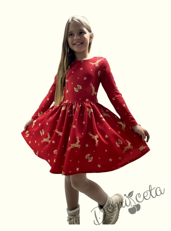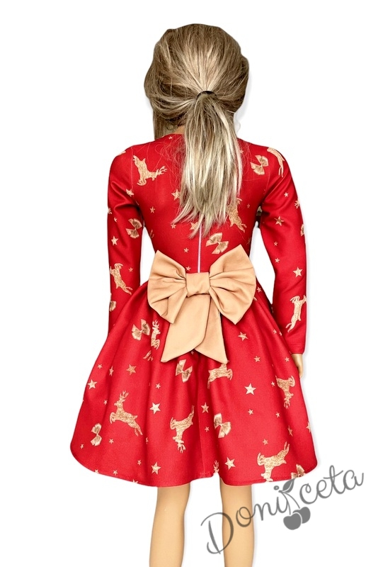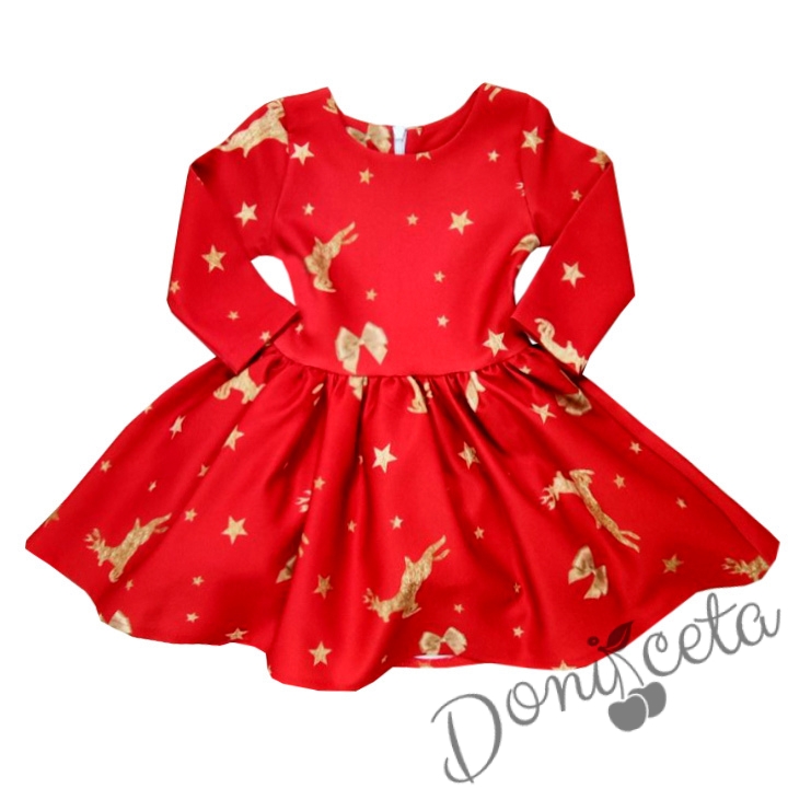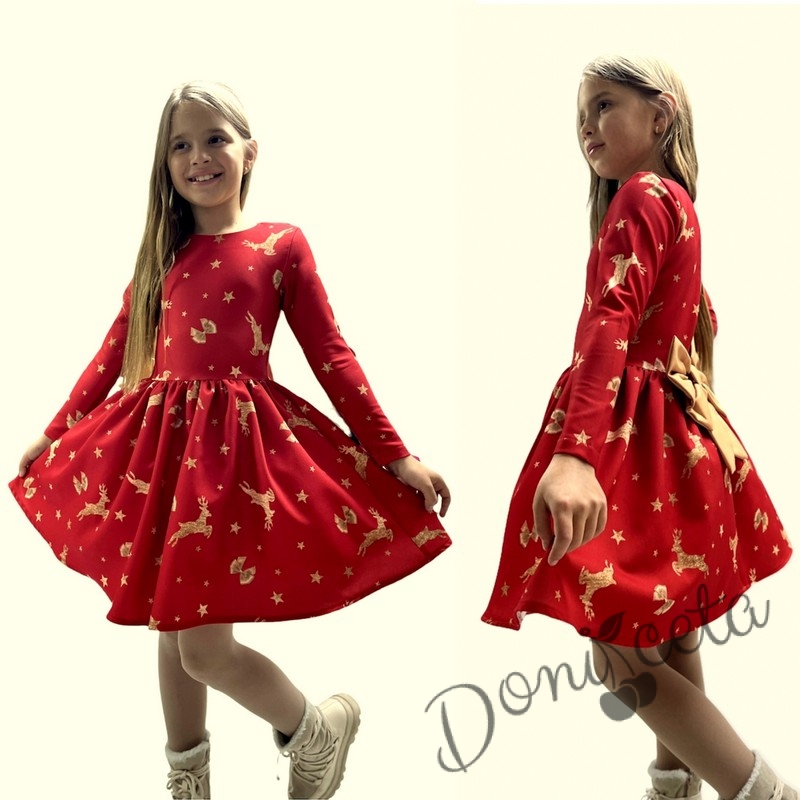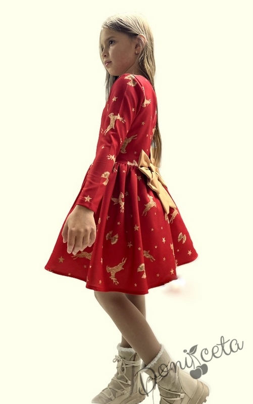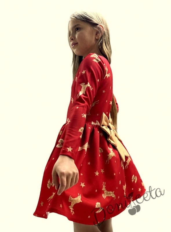 • Много красива детска рокля с дълъг ръкав в червено с еленчета и панделки.