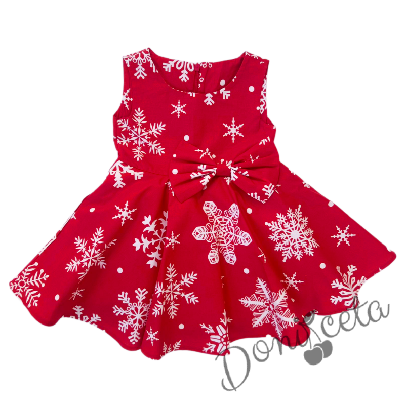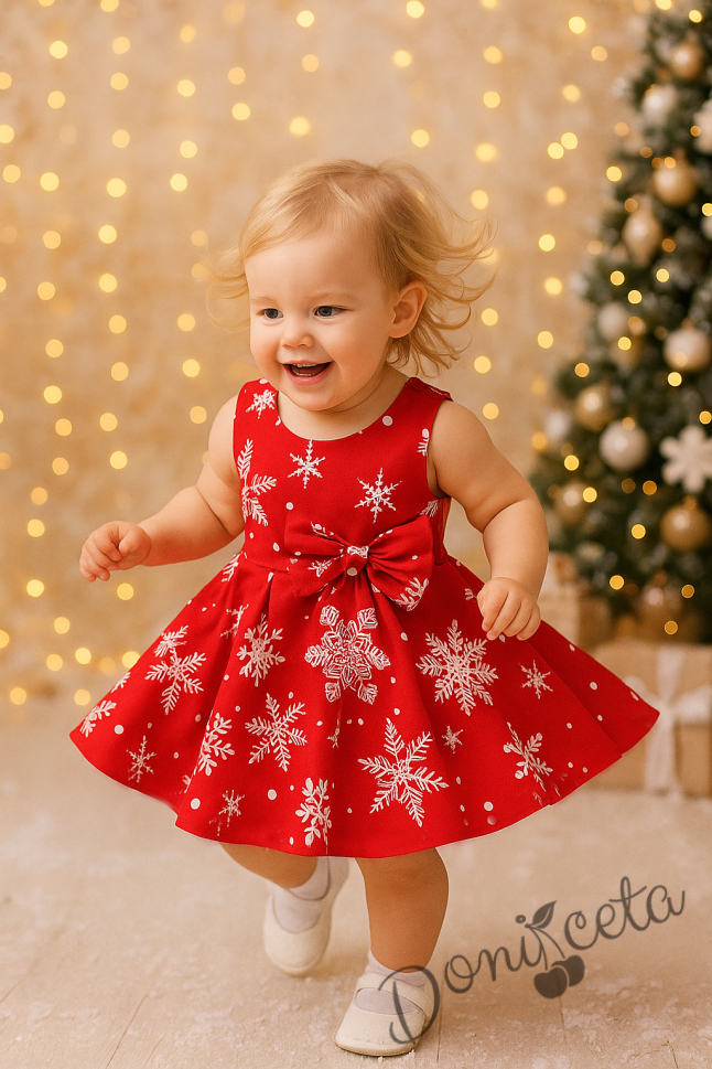 - Нежна коледна детска рокличка в червено с бели снежинки.