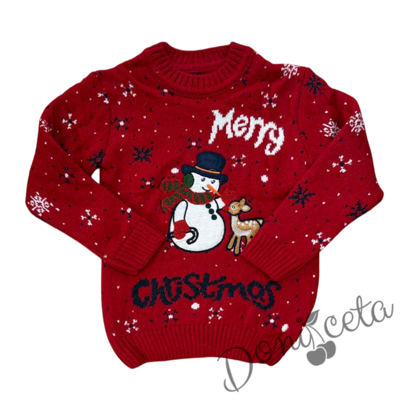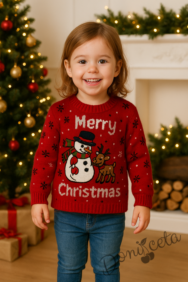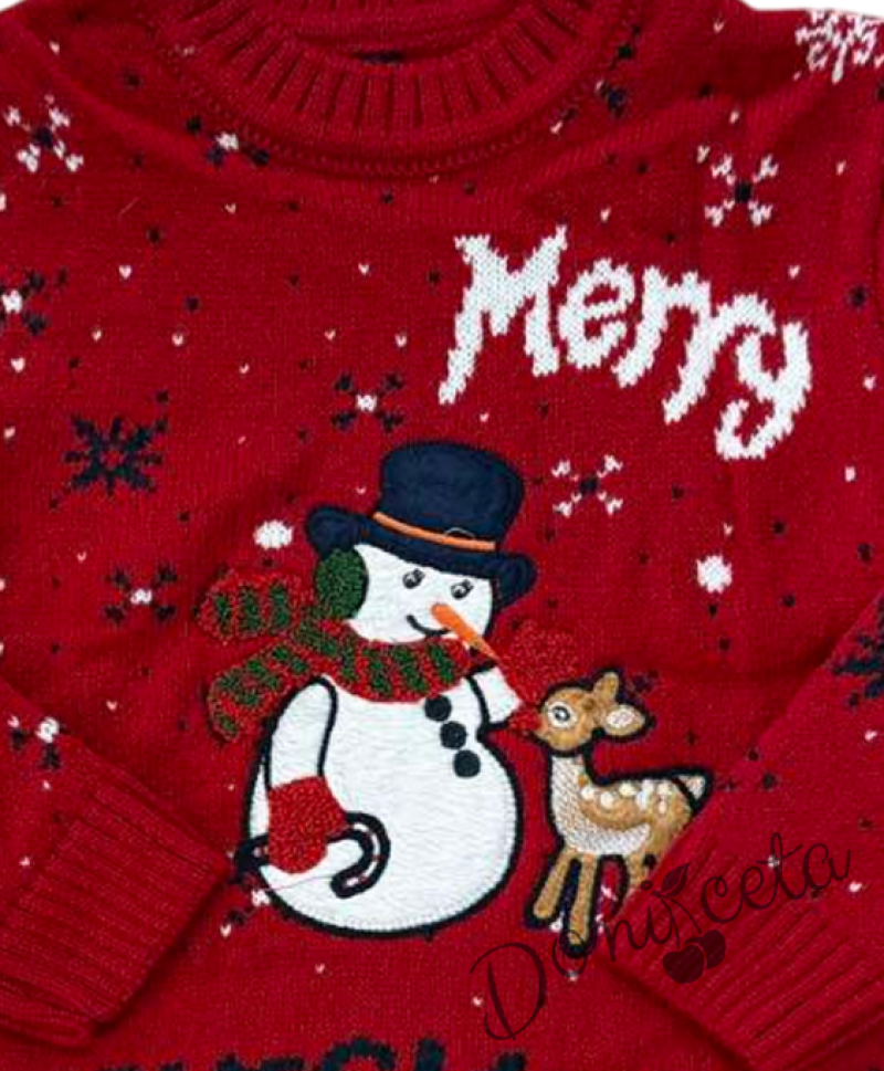 - Детски коледен пуловер с коледни мотиви със снежен човек и еленче в червено.