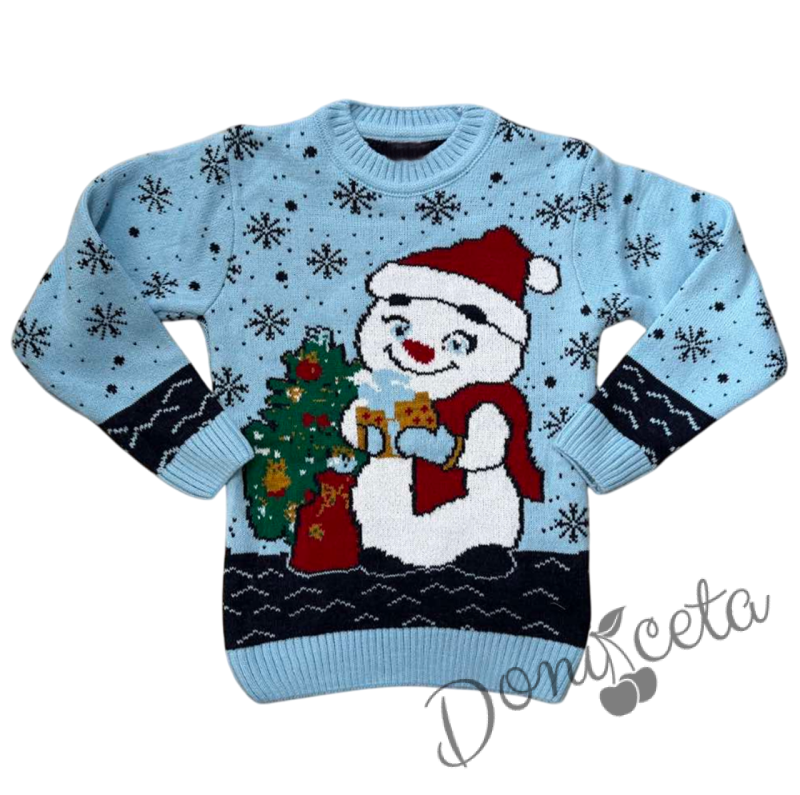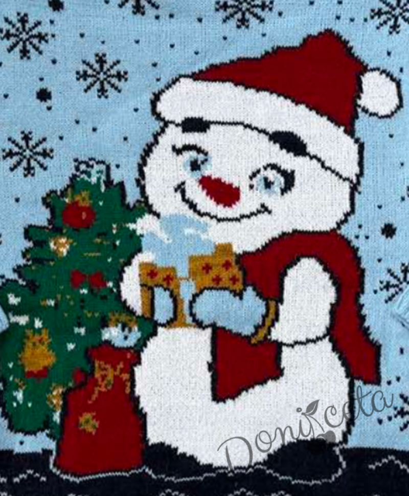 - Детски коледен пуловер с коледни мотиви със снежен човек и еленче в светлосиньо.