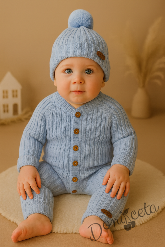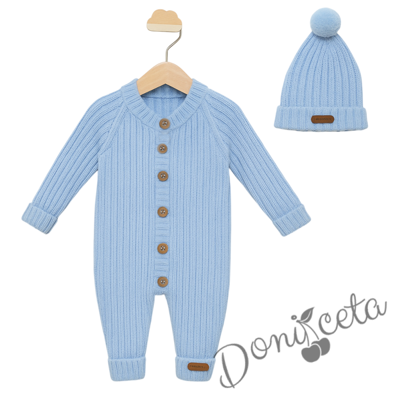 Интересен комплект от плетен бебешки гащеризон в светлосиньо с копчета и шапка