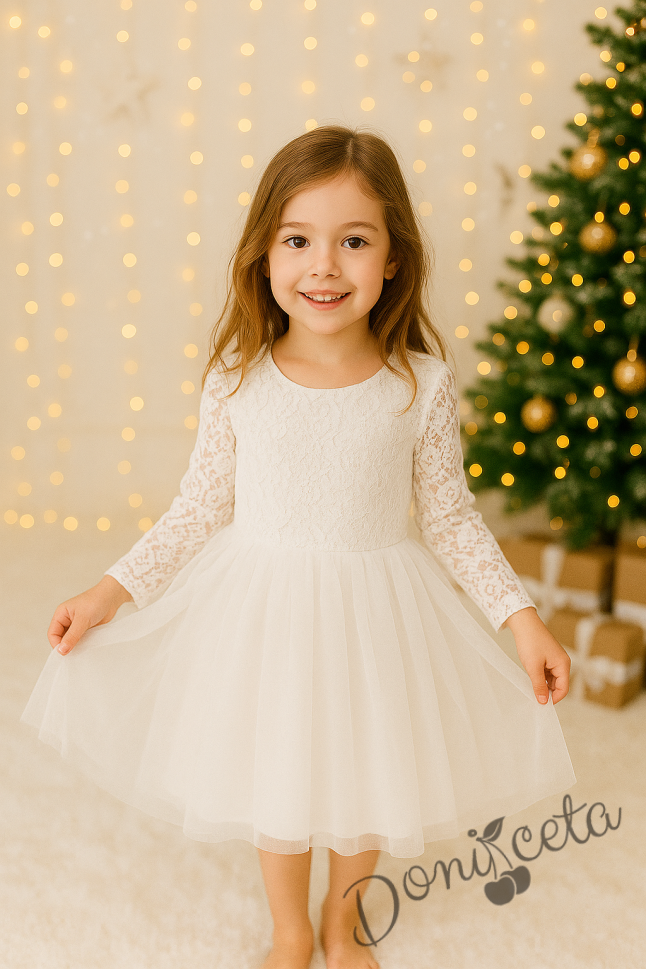 Официална детска рокля Крис с дълъг ръкав в снежнобяло с тюл и дантела