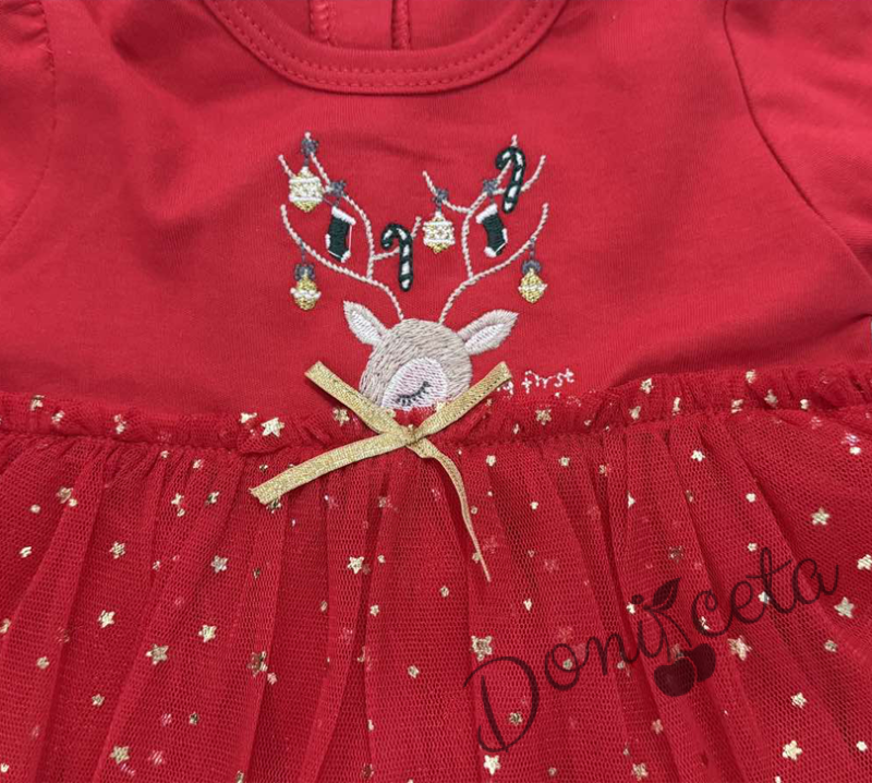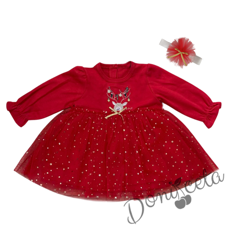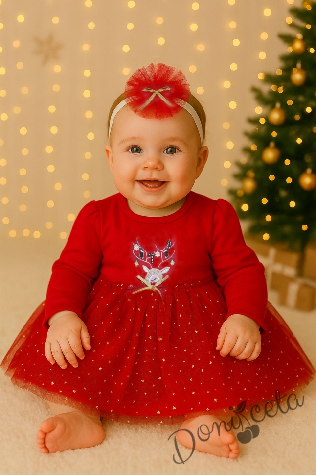 Коледна бебешка рокля с еленче и звездички в червено с диадема