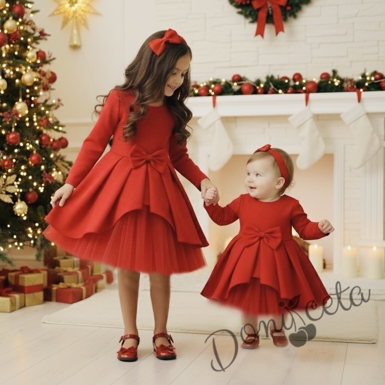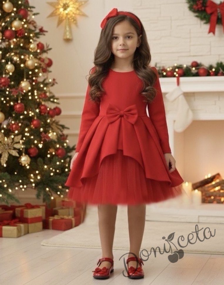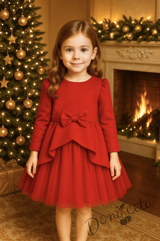 Официална детска рокля от плат Мариска с дълъг ръкав в червено с тюл