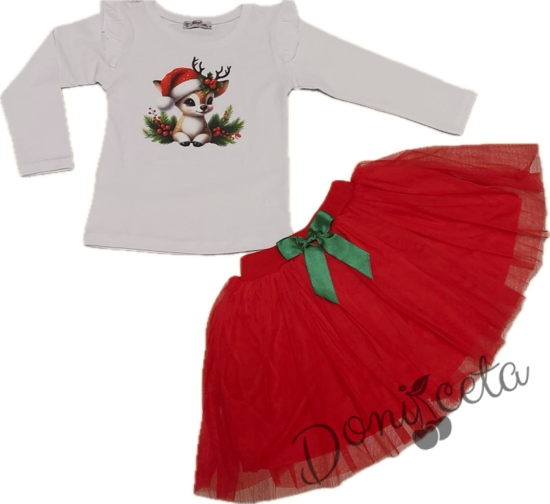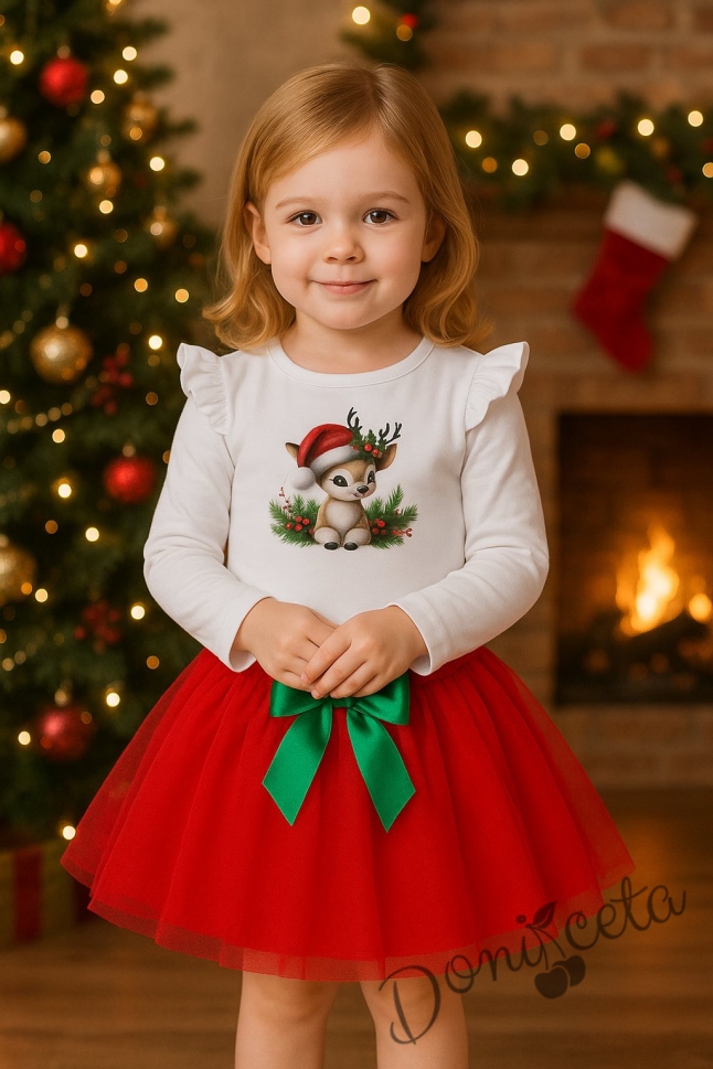 Коледен комплект за момиче от блузка в бяло с еленче и туту пола в червено