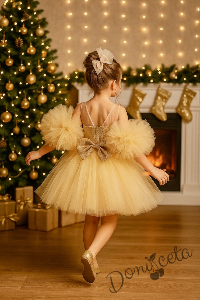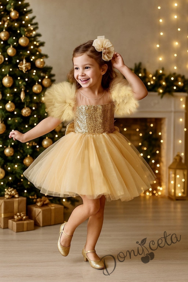 - Стилна детска къса рокля в златосто с тюл в долната част и в горната с пайети и голяма панделка отзад.