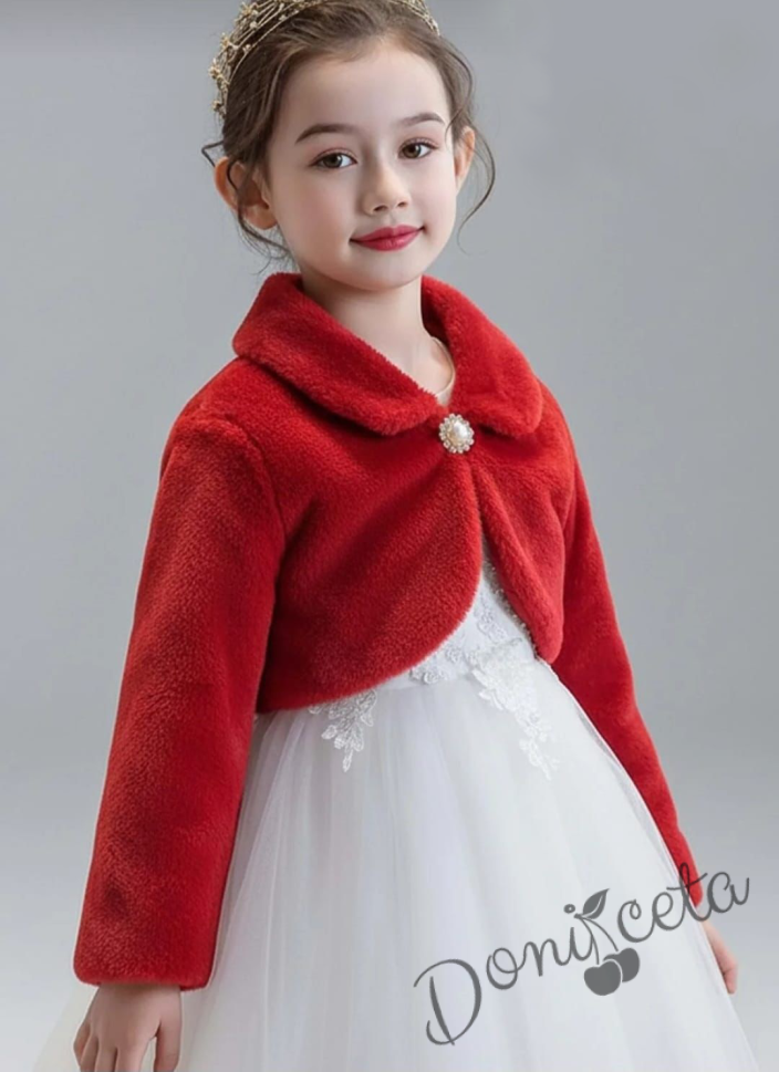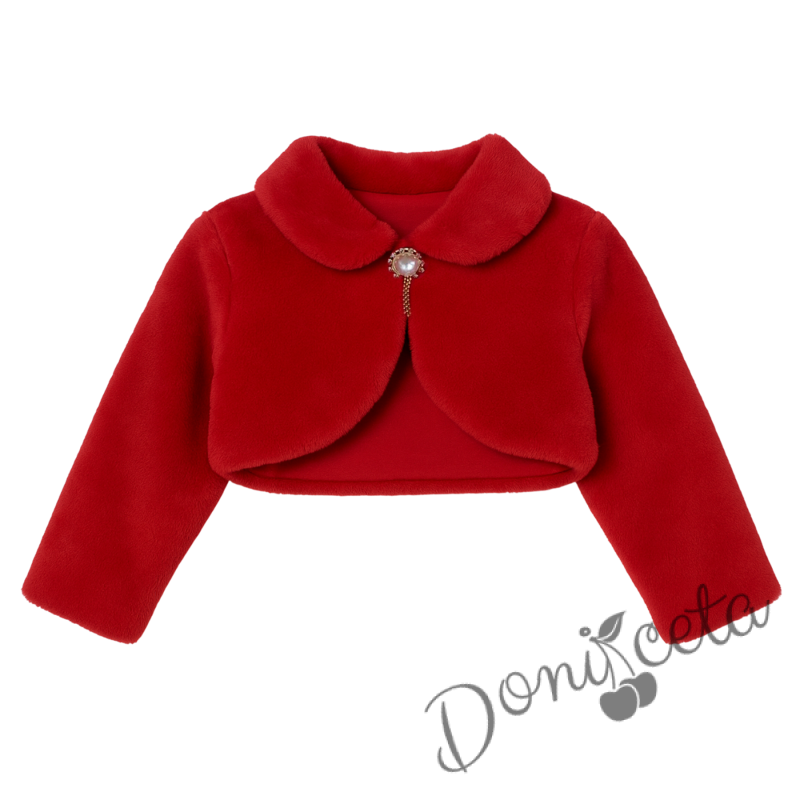 Детско пухкаво болеро в червено с якичка и с брошка за закопчаване