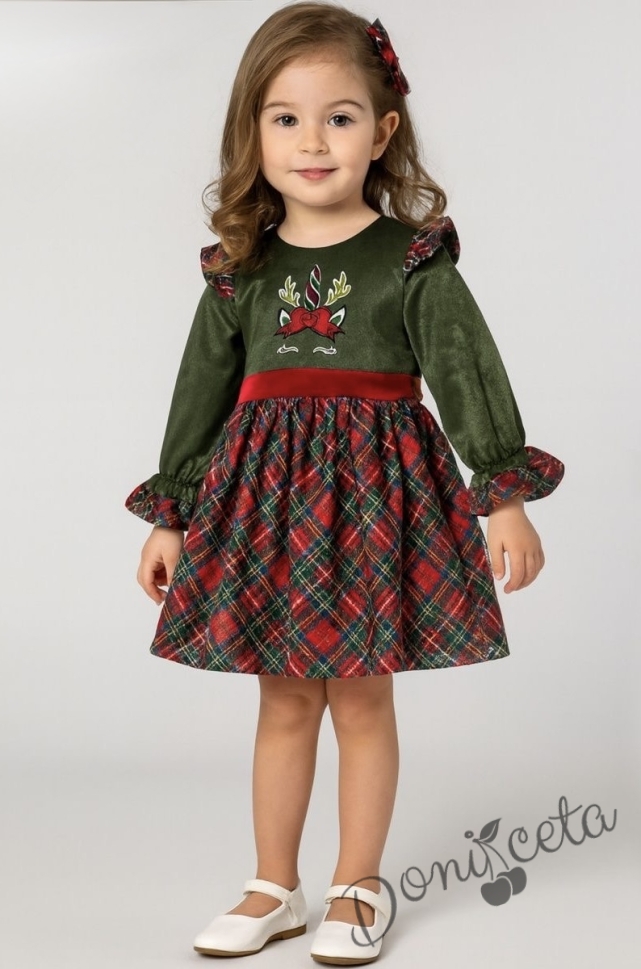 Детска коледна рокля с дълъг ръкав в зелено каре с каре