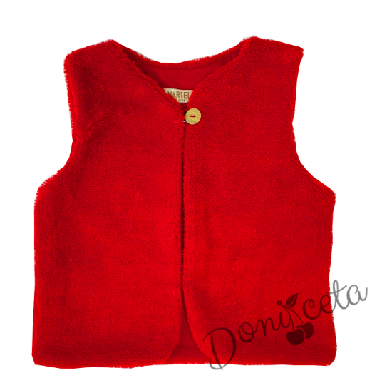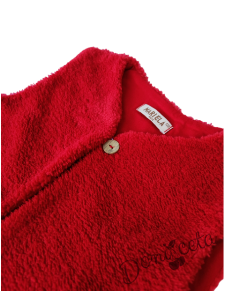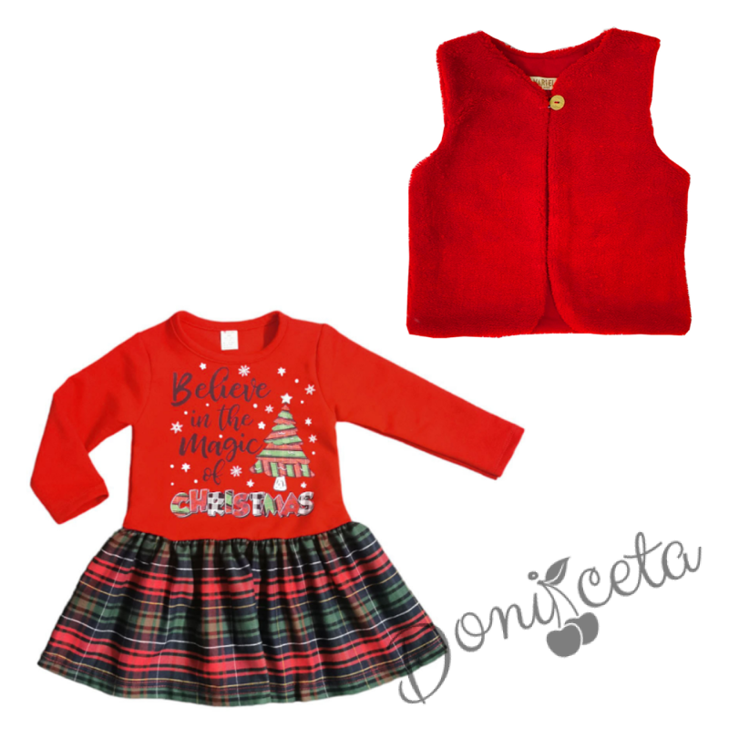 Представяме Ви уникален комплект от детска коледна рокличка в червено и каре и пухкав елек в червено