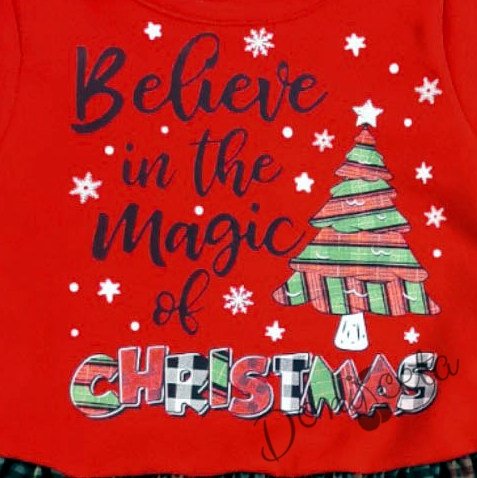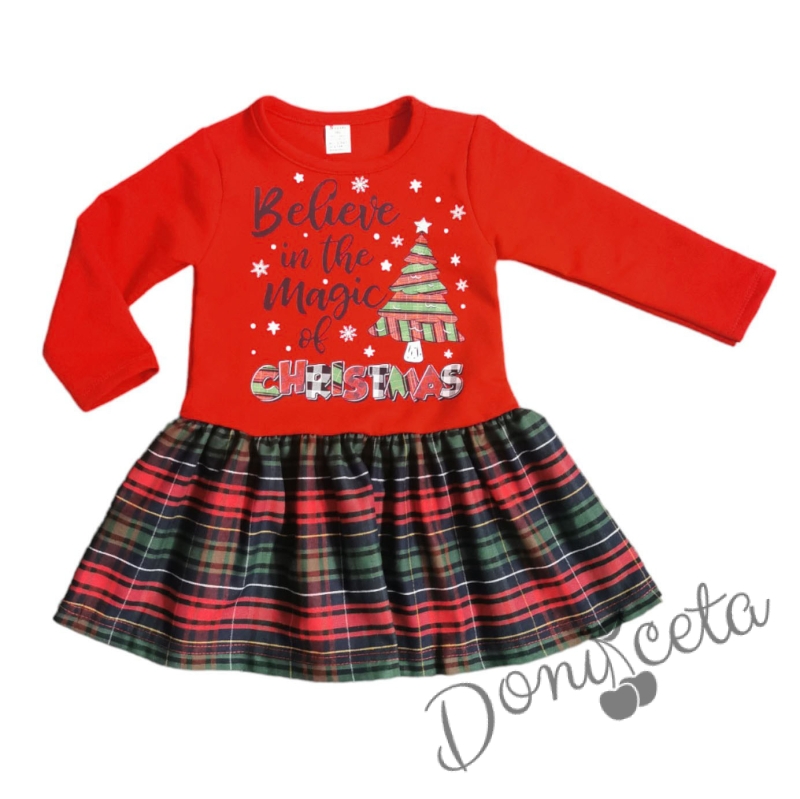 Детска коледна рокля в червено с каре с надпис и пухкав елек в червено