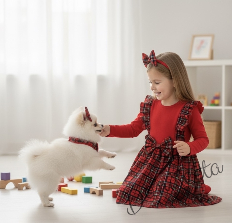 - Прекрасна детска рокля в каре и червено с дълъг ръкав и панделка в каре отшред!