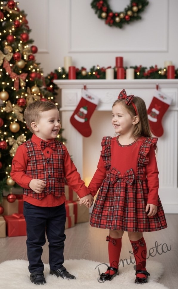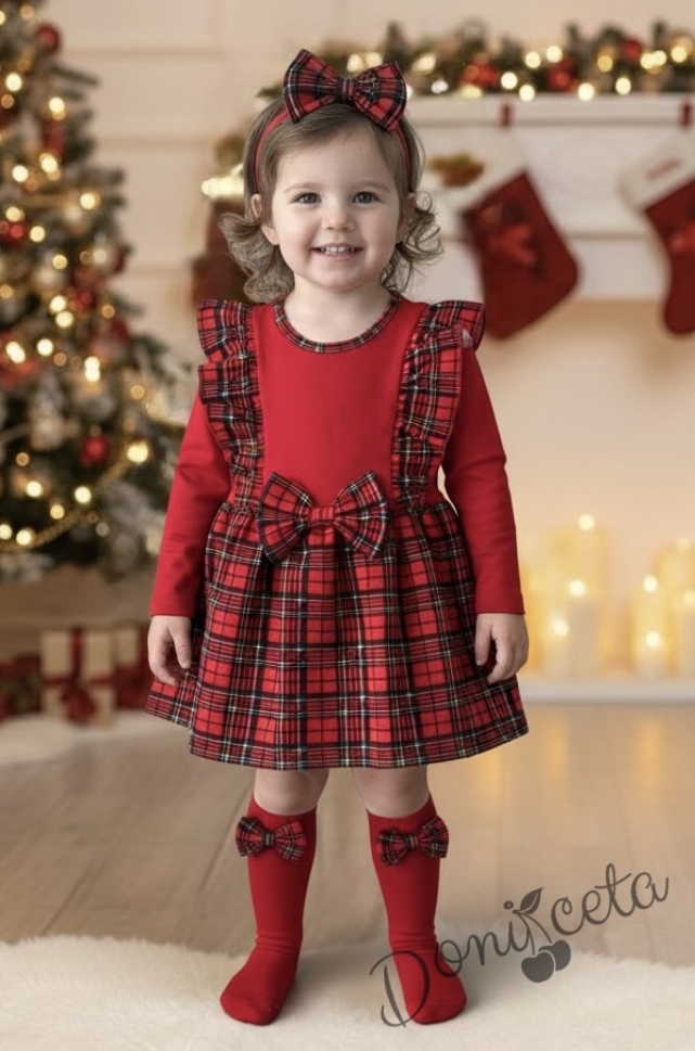 Детска коледна рокля каре в червено с дълъг ръкав и с къдрички от каре Карена