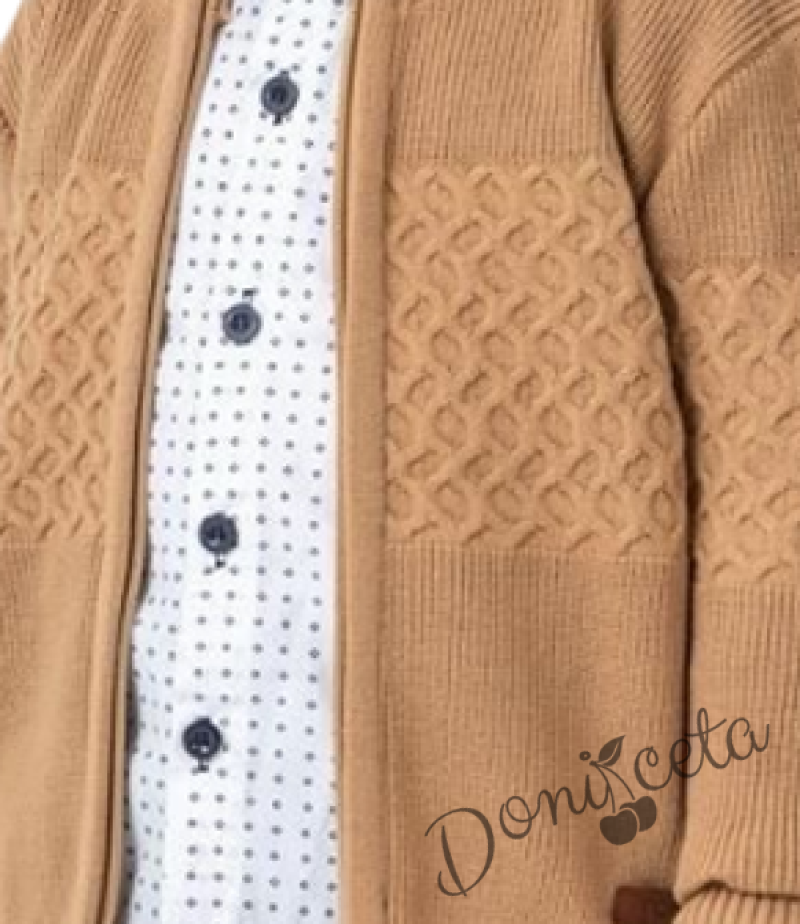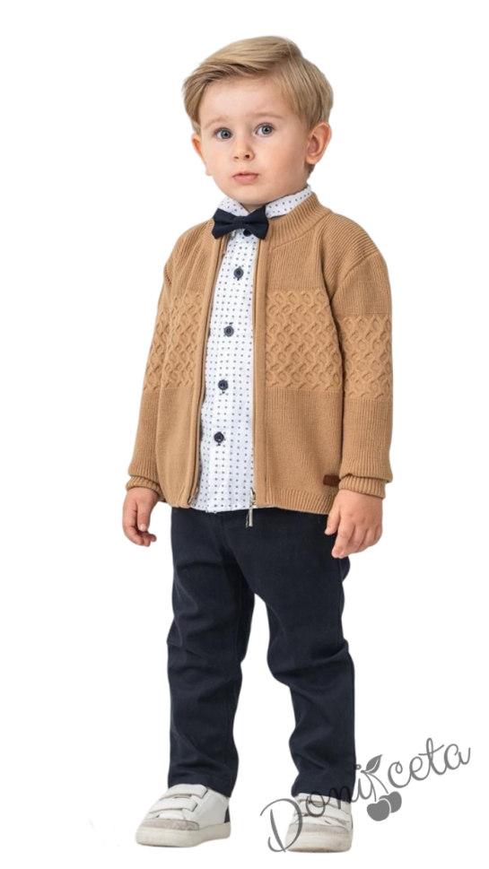 Интересен комплект от риза в бяло на черни точици, плетена жилетка в бежово, панталонки и папийонка в тъмносиньо