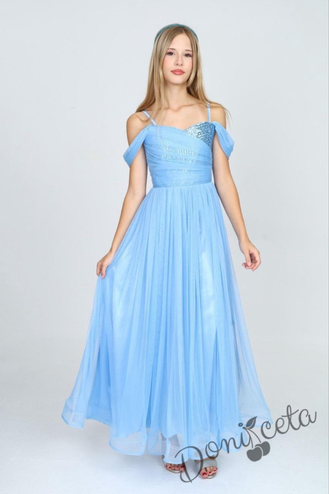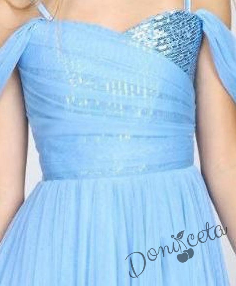 Интересна официална детска дълга рокля в светлосиньо с презрамки и паднали ръкави Мелъди
