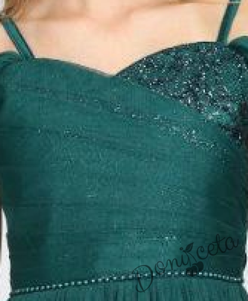 Интересна официална детска дълга рокля в зелено с презрамки и паднали ръкави Мелъди