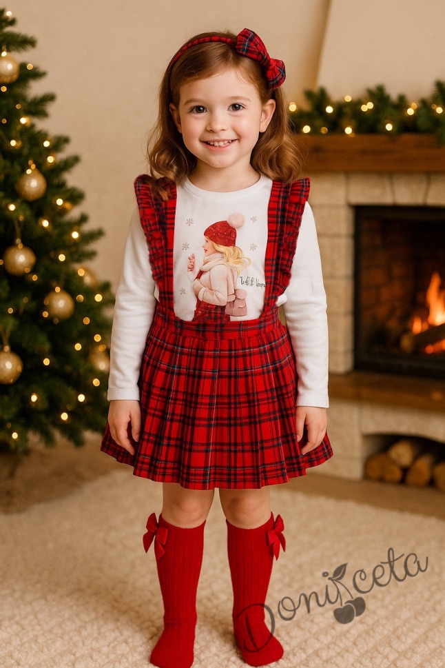 Комплект за момиче от блуза в бяло с коледна картинка на момиче и сукман в каре