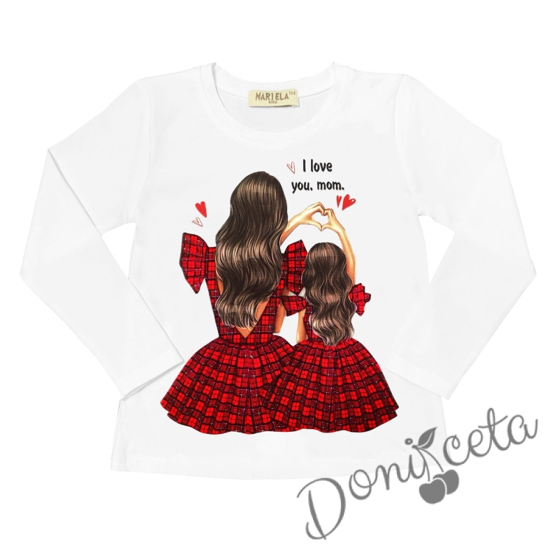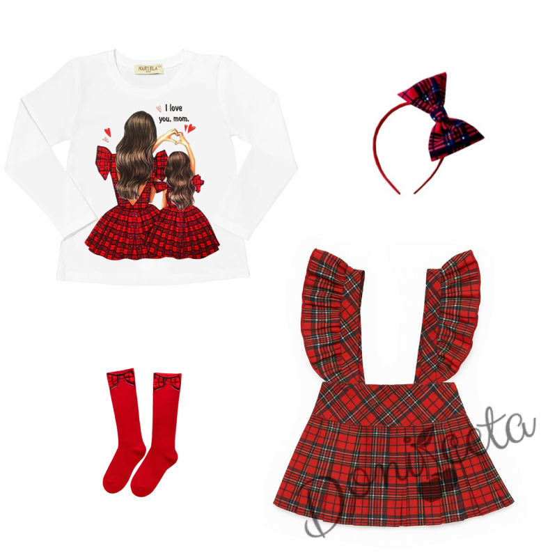 Комплект за момиче от 4 части-блуза в бяло с коледна картинка, сукман в каре, червени чорапки и диадема в каре