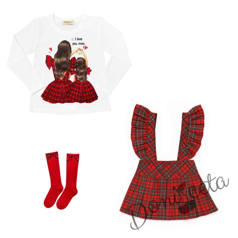 Комплект за момиче от 3 части-блуза в бяло с коледна картинка, сукман в каре и червени чорапки с панделка