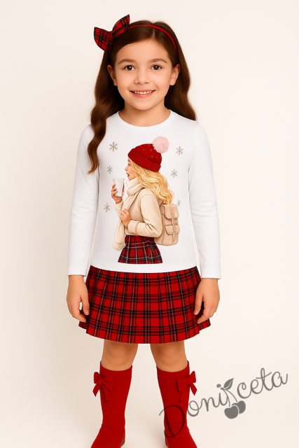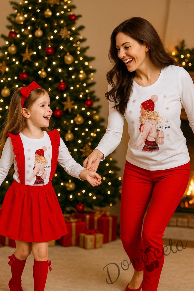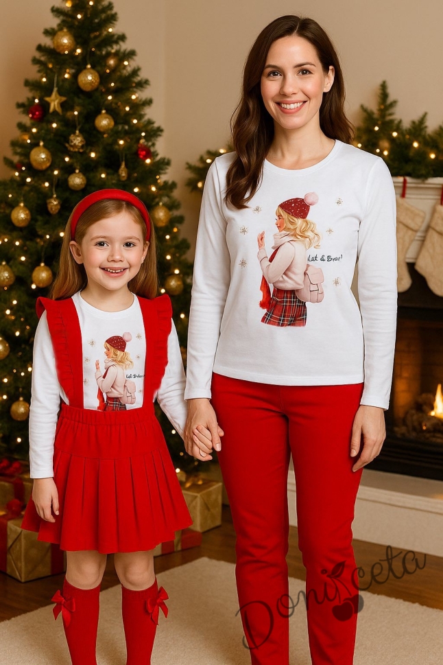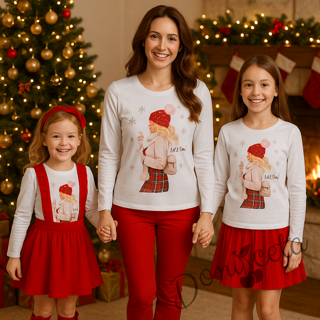 Начало МОМИЧЕТА Дамска блуза с дълъг ръкав в бяло за момиче с коледна картинка на момиче