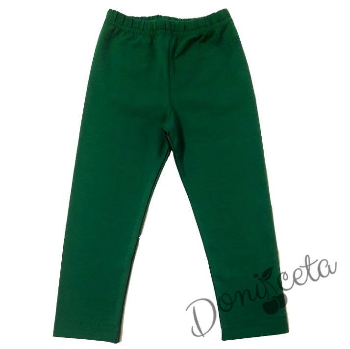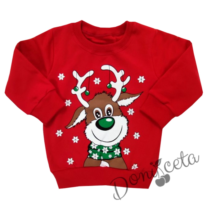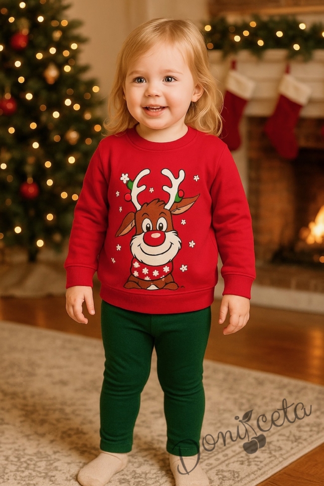Коледен комплект от ватирана блуза в червено с еленче и ватиран клин в зелено Звън